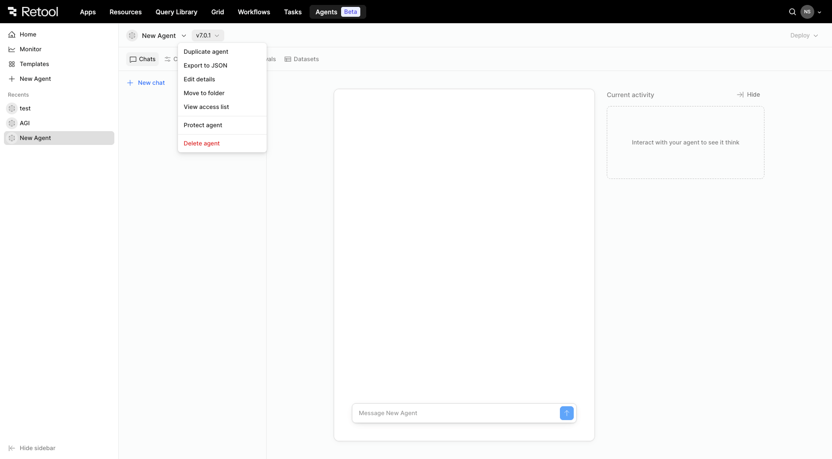 Retool Agents displays three primary pages within the left-hand navigation bar: