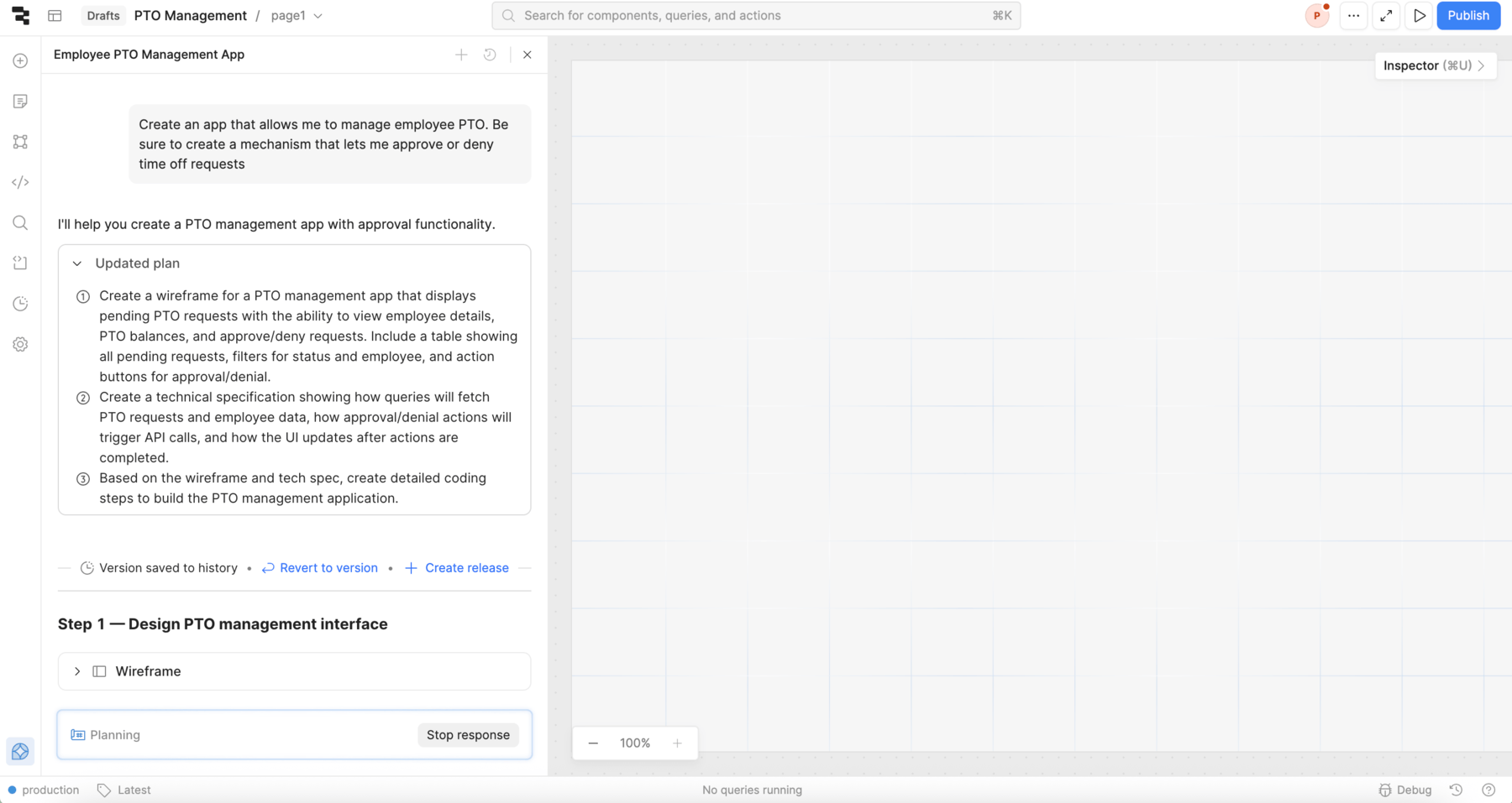 Once you prompt, Assist proceeds through several planning steps. Assist might ask clarifying questions about your prompt, such as whether you'd like to connect Retool Database or use client-side mock data.