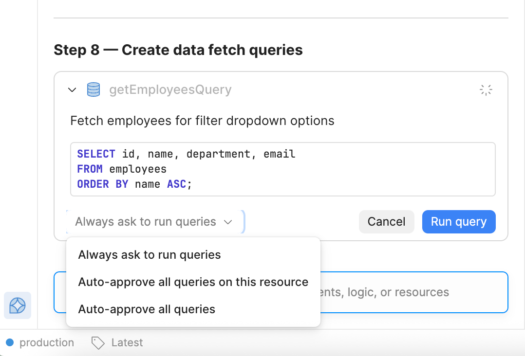 You can @ mention resources, code, and components in your prompt. For example: Update the data source for @supportTable to utilize the @Customer Support Tickets Database resource.