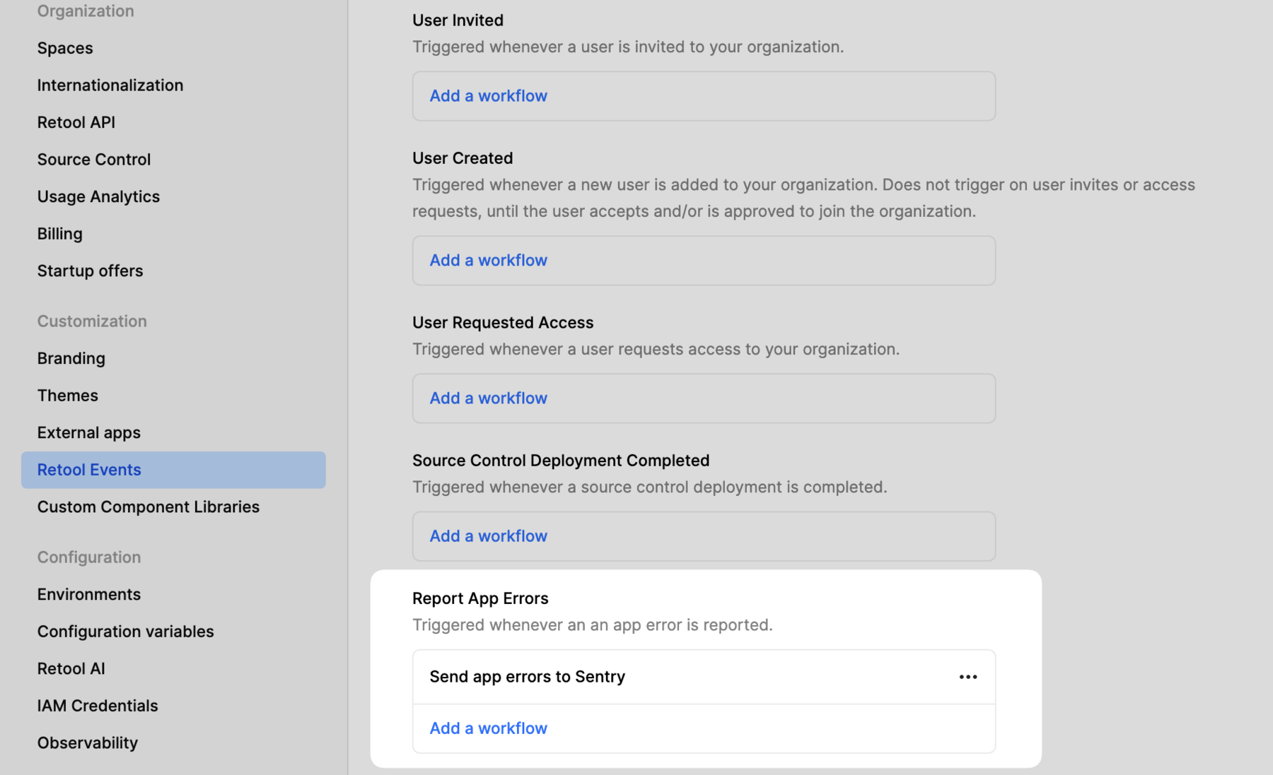 The Report App Errors event for Retool Events is now available as an opt-in beta. When enabled, you can build workflows for Retool Events to automatically reports app errors to third-party observability providers, such as Datadog and Sentry.