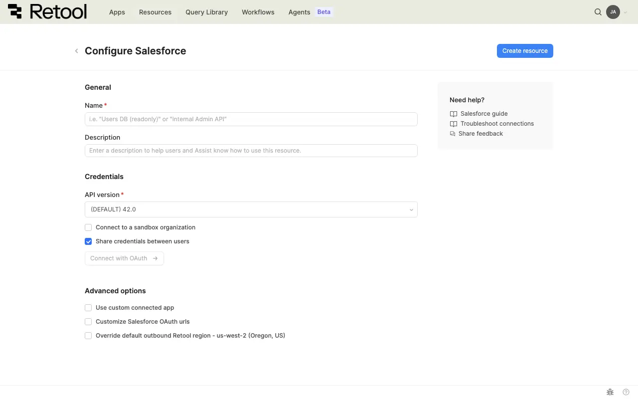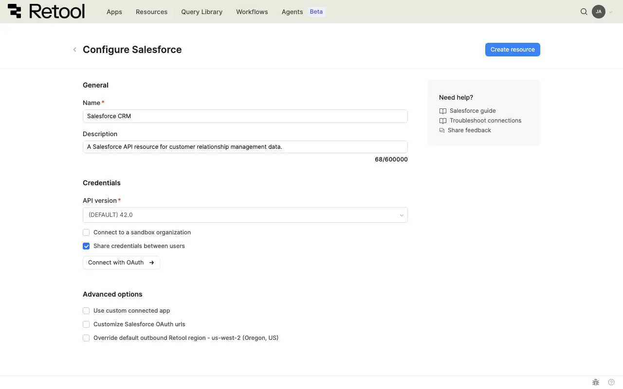 Click Create resource to save your Salesforce resource. The resource is now available to use in apps, workflows, and agent tools across your Retool organization.