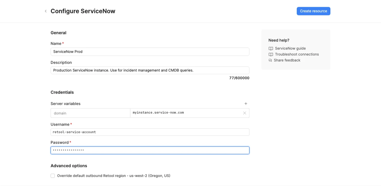 Follow these steps to create a ServiceNow resource in your Retool organization.