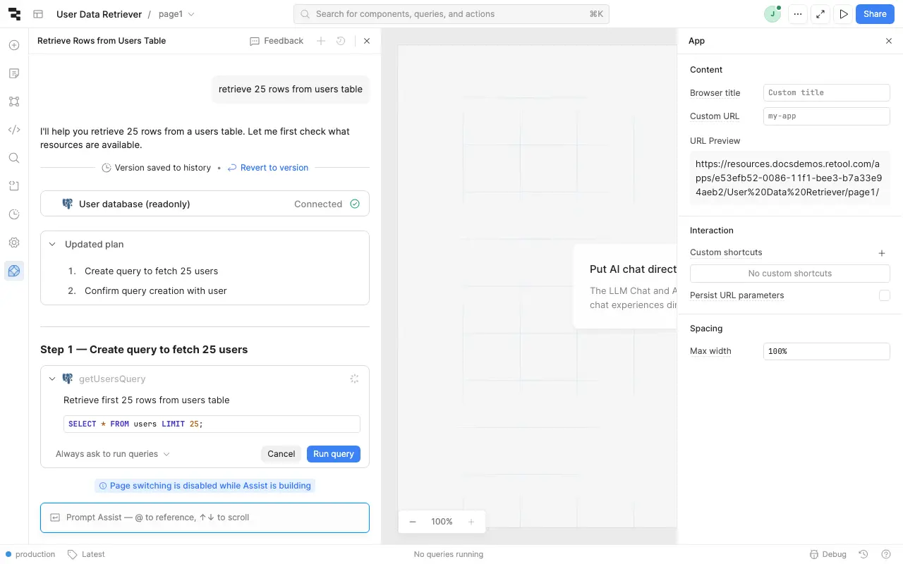 - In the Retool app IDE, click the Assist button at the bottom of the left toolbar to open the Assist panel (if not already visible).