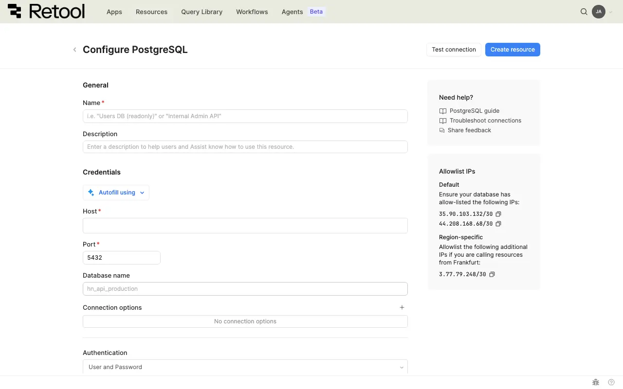 Follow these steps to create a PostgreSQL resource in your Retool organization.