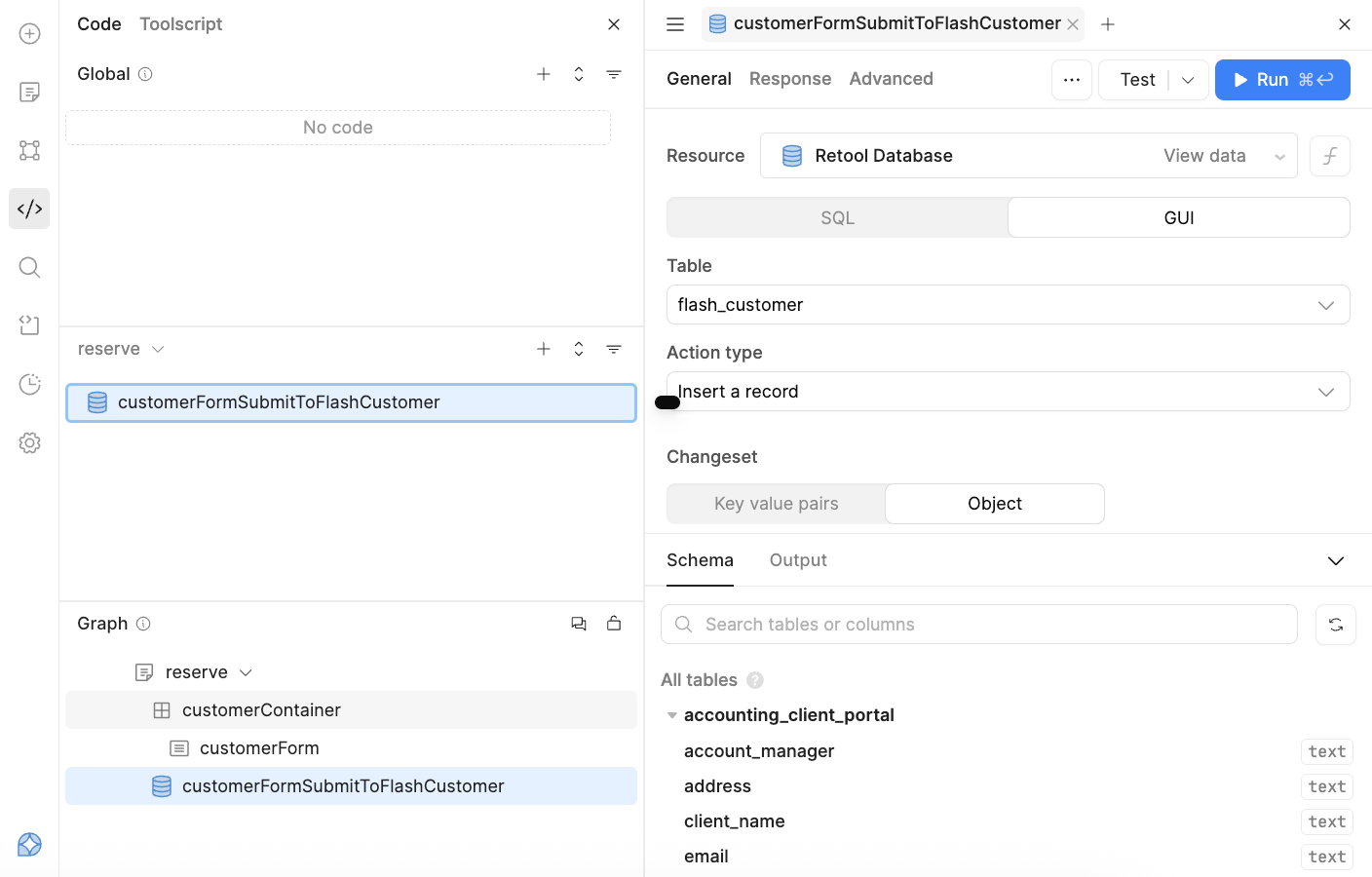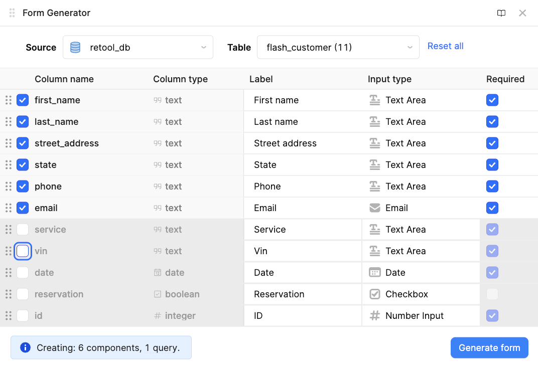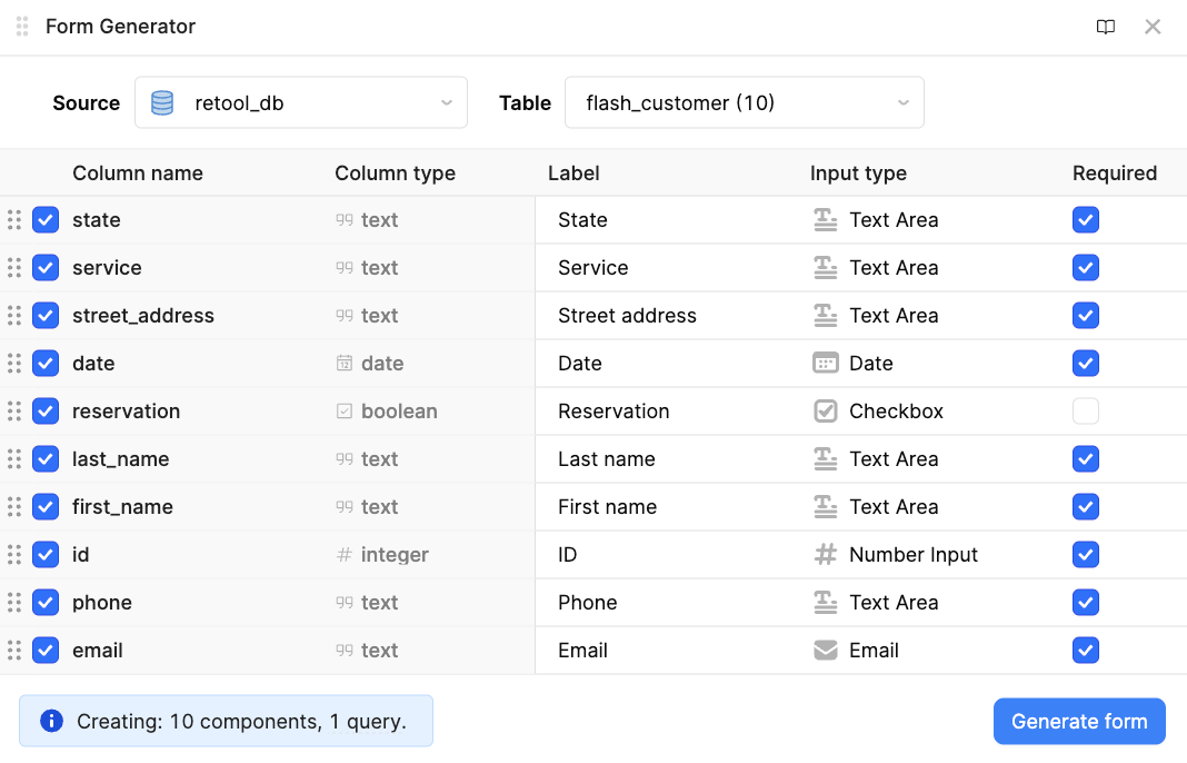 retool_db, Table,flash_customer(11). This will update the Form Generator display to show the following: