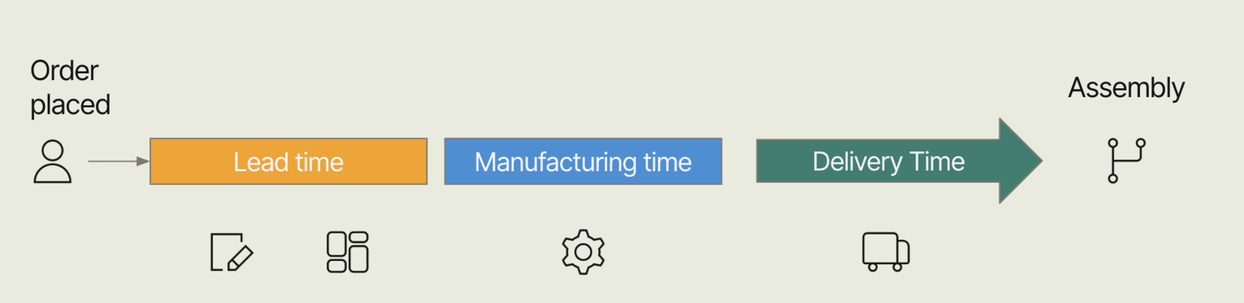 As shown in the image when an ordered is placed the total time it takes for Flash Mobility to receive new assemblies is represented by Lead Time + Manufacturing Time + Delivery Time.