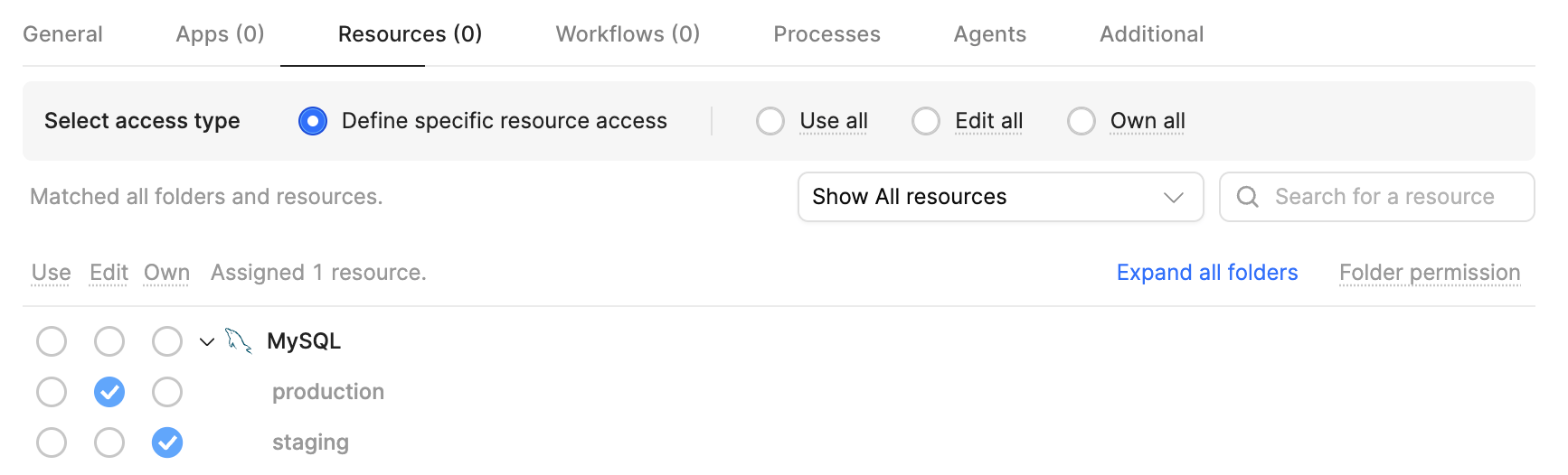 Select the Apps, Resources, Workflows, or Agents tab to configure their respective access rules. The Select type option enables you to define specific access by configuring access individually, or apply Use all, Edit all, or Own all.