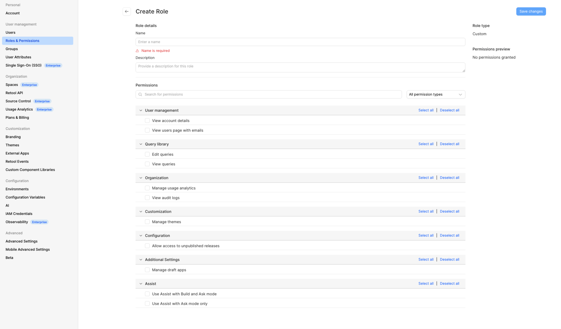 For example, a Business plan customer can create a role that grants access to the query library. Whereas, an Enterprise customer with admin granularity can additionally create roles that grant access to SSO configuration, billing management, or user attribute management.