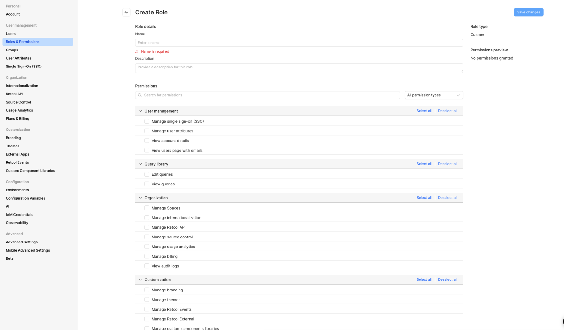 - Configuration: Environments, configuration variables, Retool AI, IAM credentials, observability, mobile settings.